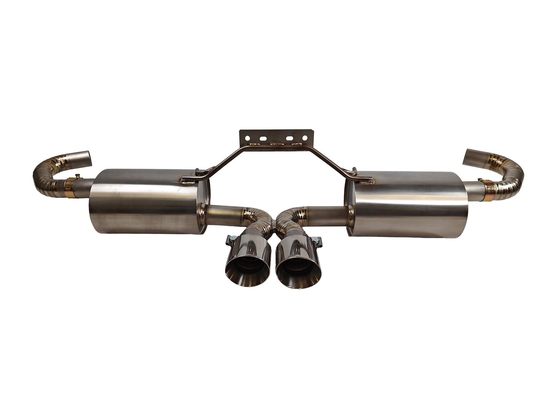 Circuit Werks latest 1997-2004 Porsche Boxster 986 Dual Muffler Version 2 X-Pipe Exhaust System This system Features Titanium C-Pipes, 3.5″ Thick Walled Adjustable Titanium Tips, and Built in X-Pipe for much better refined tone. Fits all 1997-2004 Base Models and Boxster S Models. Fits all: 97-99 986 2.5L & 00-04 2.7L and 3.2L. Twin angle cut 3.5″/ 89mm Thick Wall Tips. These are the newly updated tips compare to the older multi-layer designed tips. Fits perfectly between your rear bumper. Took 3 years to develop this brand new system with brand new jig. The inlets are 1.75″/ 45mm connecting to your existing OEM pipes, clamps to your OEM Exhaust Pipes reusing your OEM Exhaust Sleeve/Hardware. The 3.5″ dual tips will be exposed from your rear bumper giving it the Sport look.